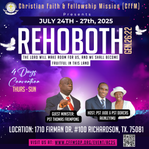 We joyfully invite you to the Annual Convention of Christian Faith and Fellowship Mission – Sanctuary of Praise! This year’s theme, ROHOBOTH, speaks to God’s promise to create space for growth, increase, and lasting fruitfulness in our lives. Over four spirit-filled days, we will press into the Word, prayer, and powerful teachings that will equip and inspire us for the journey ahead.